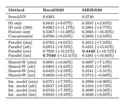 Parallel 并行更新 item ID 和 feature 的模型达到最好的效果,Parallel shared-W 和 Parallel interaction 交互模型并没有好的效果,可能原因重复的序列信息加重了模型的训练负担。