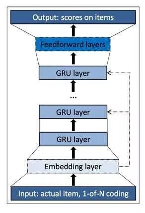 模型输入:session 中的点击序列,, 1 ≤ r < n,通过 one hot encoding 编码,通过 embedding 层压缩为低维连续向量作为 GRU 的输入。