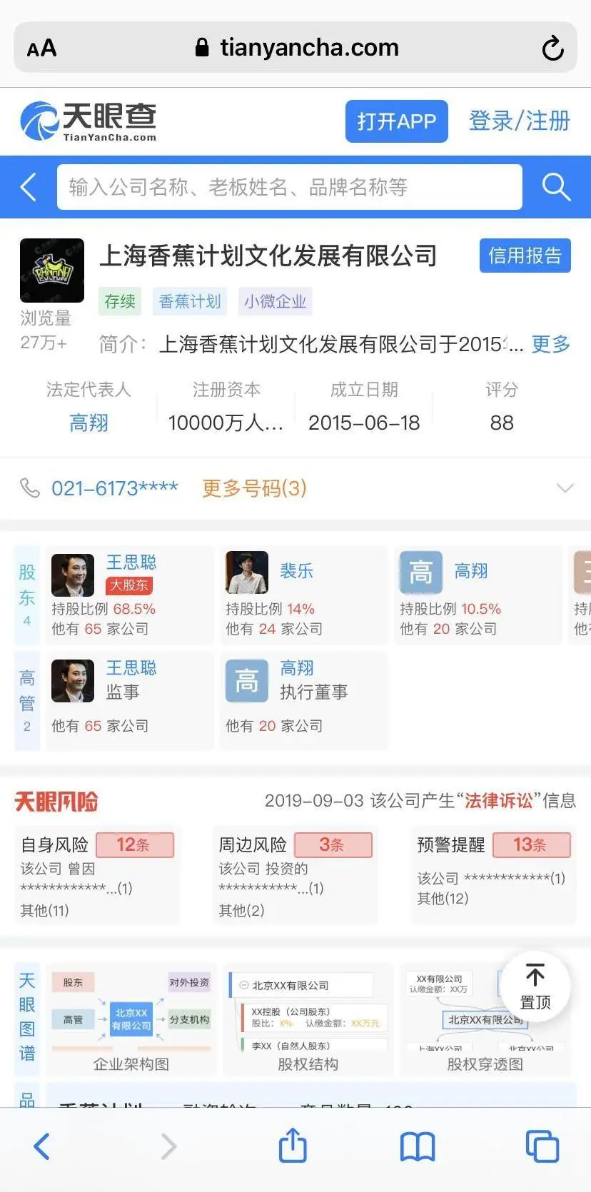 据天眼查显示,近日,上海香蕉计划文化发展有限公司被上海市静安区市场监督管理局列入经营异常名录,原因为“公示企业信息隐瞒真实情况、弄虚作假的”。该公司成立于2015年6月,注册资本1亿人民币,由王思聪持股68.5%。