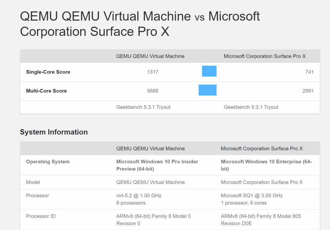 「跑分对比」M1 Mac 使用虚拟机跑 Windows 10,Geekbench 5 跑分单核 1317, 多核 5685,成绩依然可观。反观微软的 Surface Pro X,搭载高通骁龙 SQ1(特大号版骁龙 855),两项成绩基本只有 M1 的一半...