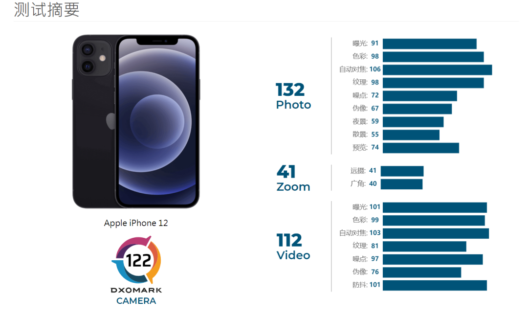 iPhone 12 的 DxOMark 评分出出炉了,总分 122,拍照 132、变焦 41、视频 112。最主要的优势还是在于 HDR,以及精准的曝光、Pro 级的视频。主要的问题是变焦细节有限、视频伪像等等。