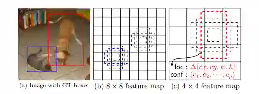 该方法使用前馈卷积神经网络,产生特定目标的一组边界框和分数,添加了卷积特征图层,允许在多个尺度上进行特征检测,在此模型中,每个特征图单元格都关联到一组默认边界框,下图显示了SSD512模型在动物,车辆和家具上的表现。