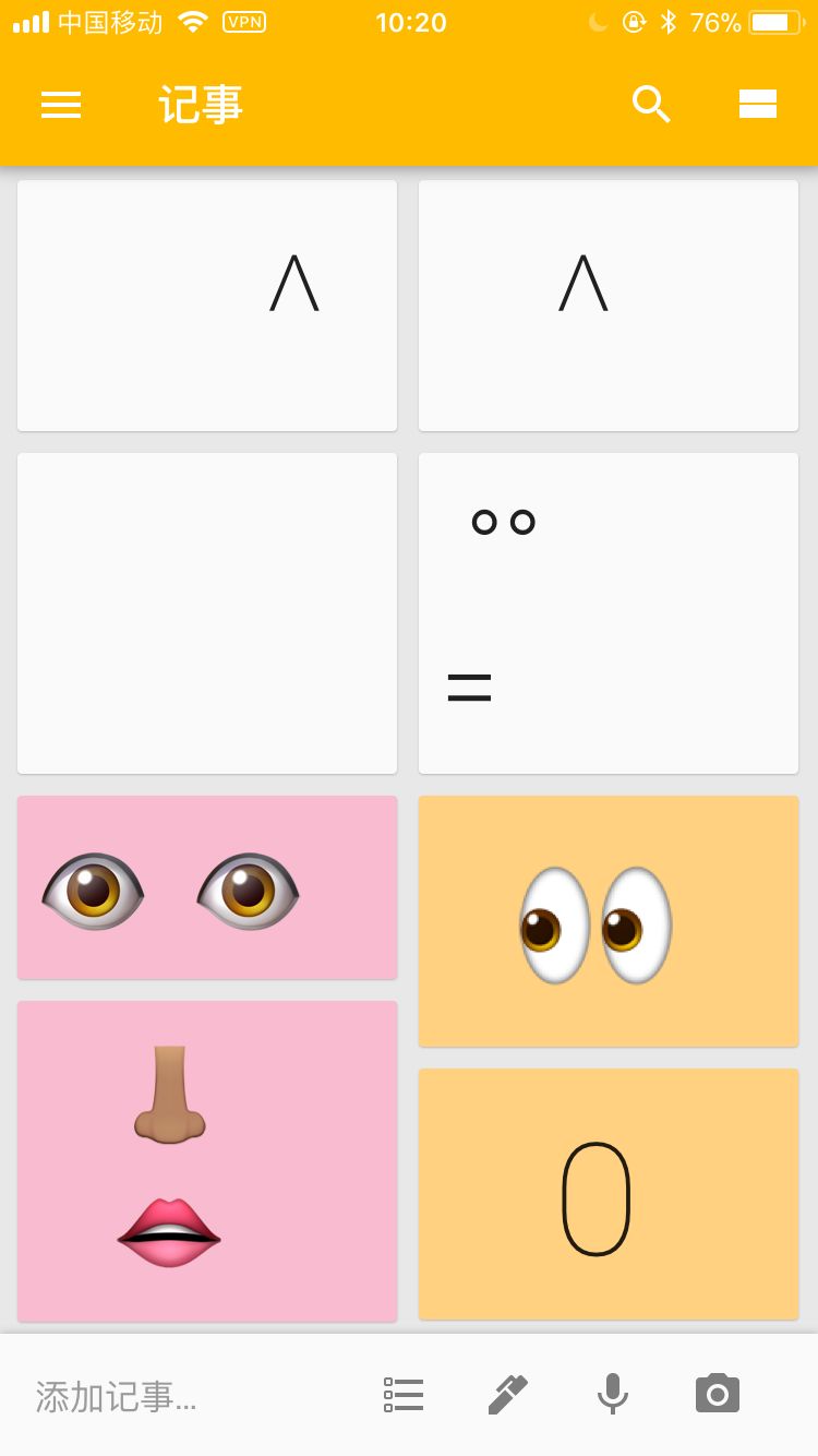 还是得益于 Google Keep 的交互特性,当为每个笔记只添加少量字符的时候,主页卡片上每个字符会显示得很大,无聊的时候可以做些大字图玩儿。