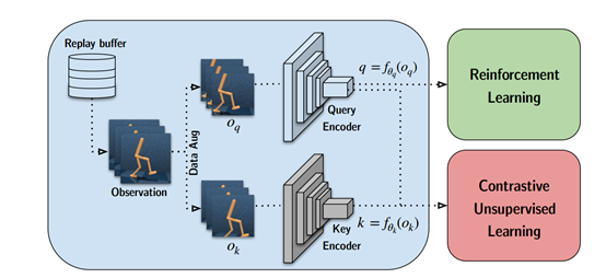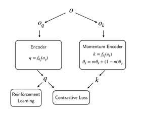 从缓冲区采样一批转换后的观察数据,观察数据被扩充两次以形成query观察值和key观察值,然后分别用query编码器和key编码器对它们进行编码。query被传递给RL算法,而query-key对被传递给表示学习目标。在梯度更新步骤中,只有query编码器被更新,key编码器权重是query权重的moving average (EMA)。如下图所示:
