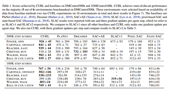 我们提出CURL:用于强化学习的对比无监督表示法。CURL使用表示学习从原始像素中提取高级特征,并在提取的特征上执行off-policy控制。在DeepMind控制套件和Atari游戏中,CURL在复杂任务中的表现优于之前基于像素的方法,无论是基于模型的还是无模型的,在100K环境和交互步骤的基准测试中,分别获得1.9倍和1.6倍的性能提升。在DeepMind控制套件中,CURL是第一个与使用基于状态特征的方法的采样效率和性能接近的基于图像的算法。