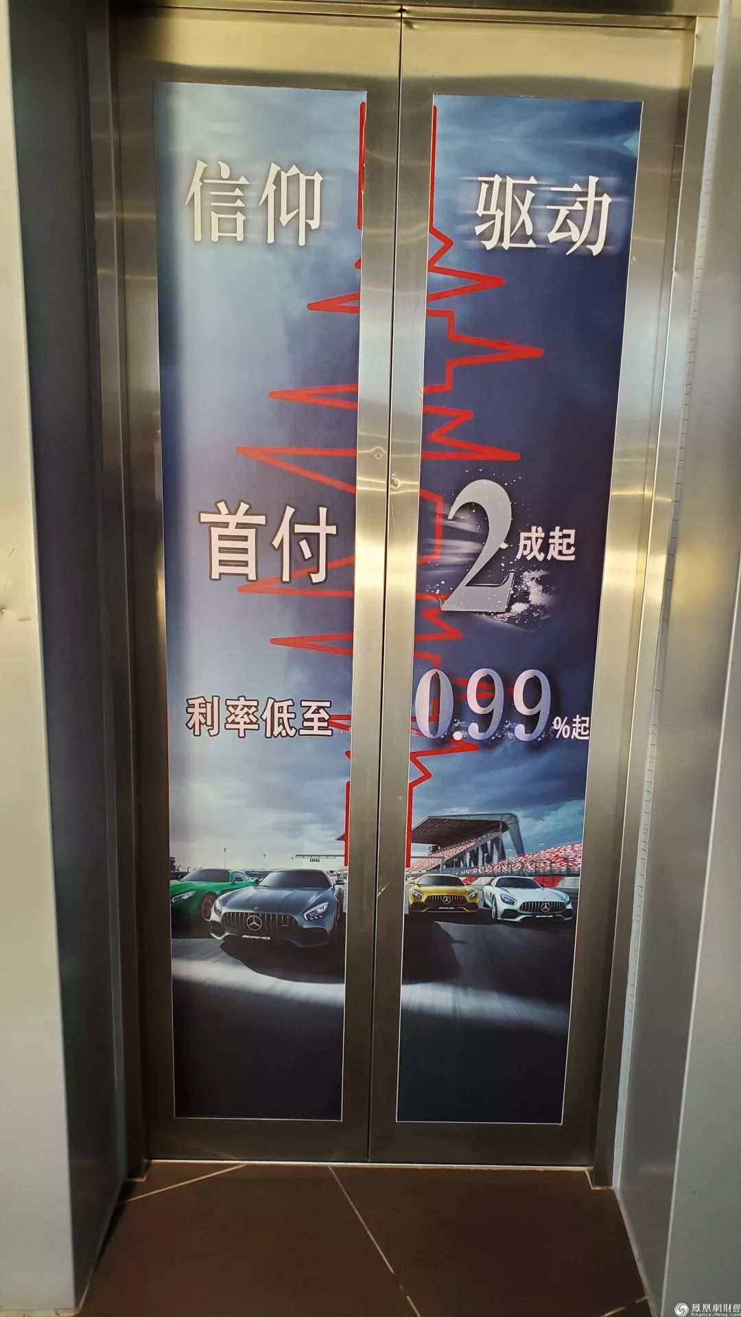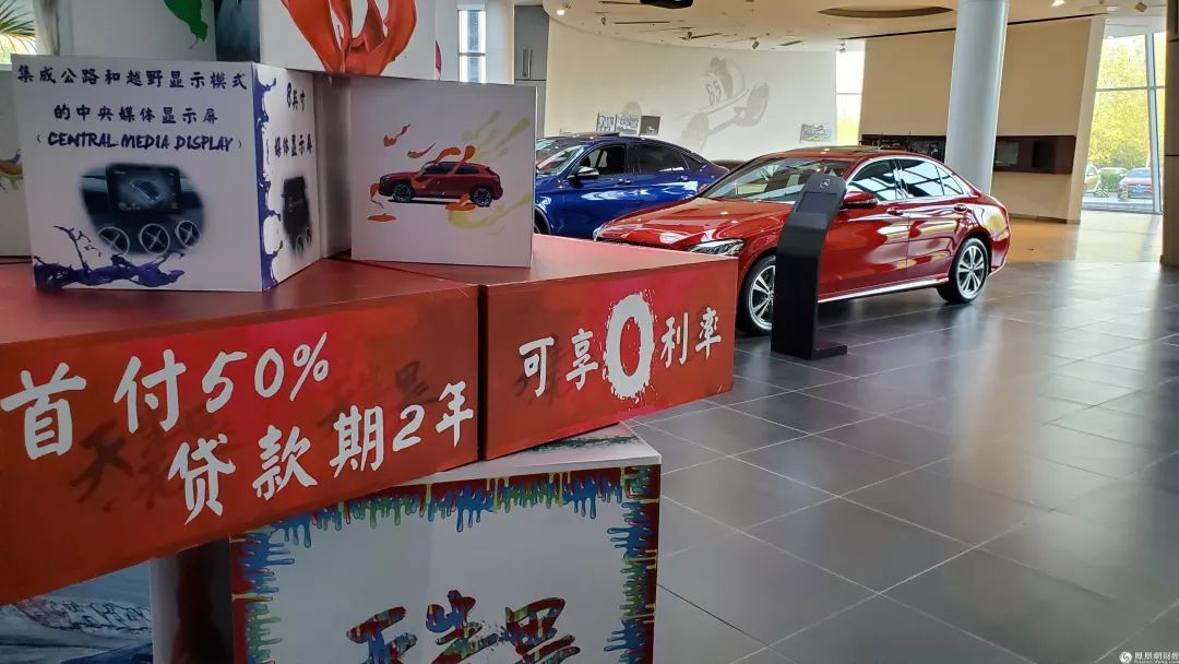图:北京朝阳区的极光星徽奔驰4S店前台贴着“成功人士都在贷款,70%的奔驰车主选择分期购车,你还犹豫吗?”广告横幅