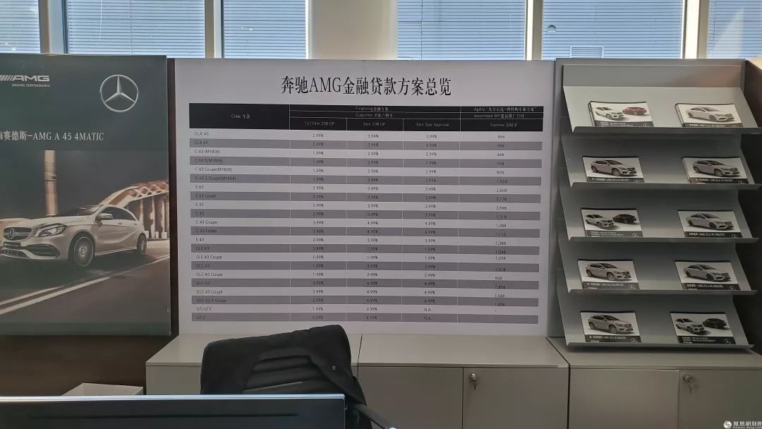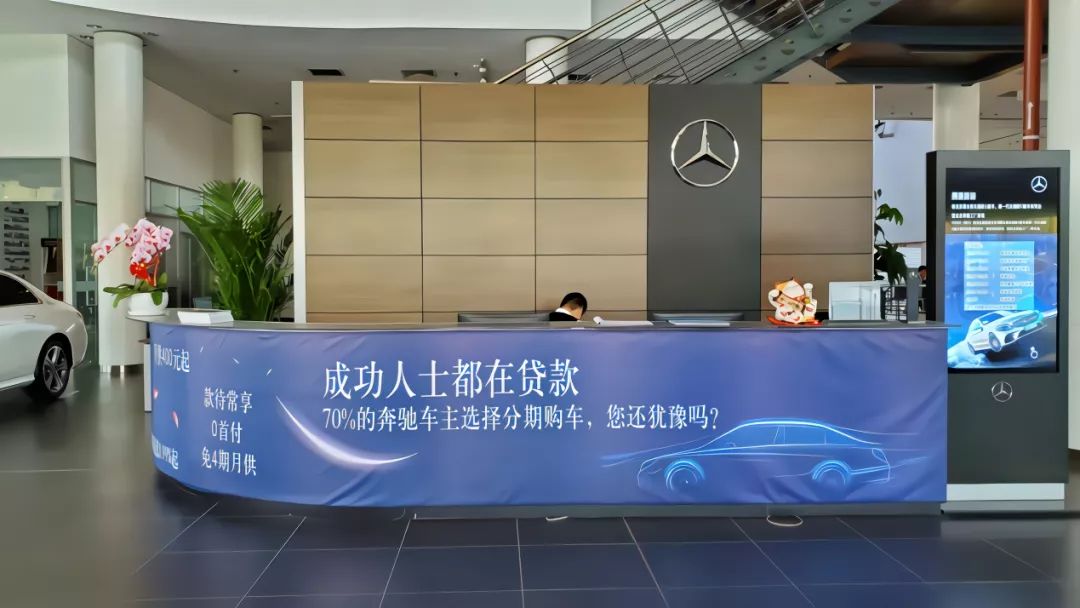 在极光星徽奔驰4S店内,奔驰金融汽车分期的宣传海报随处可见。图/田牧