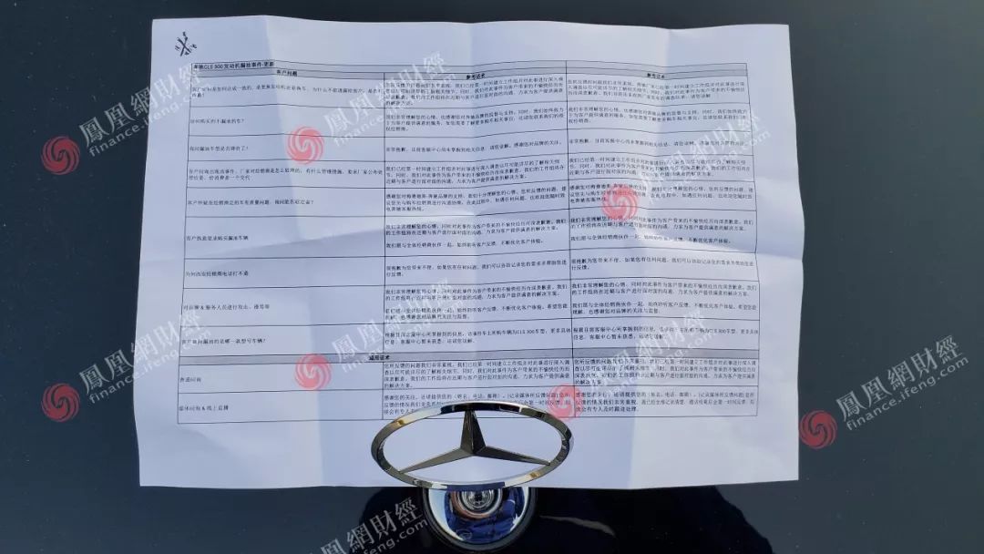 西安奔驰女车主维权一事持续发酵,4月15日,凤凰网财经来到位于北京朝阳区的极光星徽奔驰4S店实地探访奔驰金融服务费事宜。有趣的是,在4S店现场,凤凰网财经独家获得了一份奔驰关于“奔驰CLS 300发动机漏油事件”客户、媒体等关心问题回应的参考话术文本。
