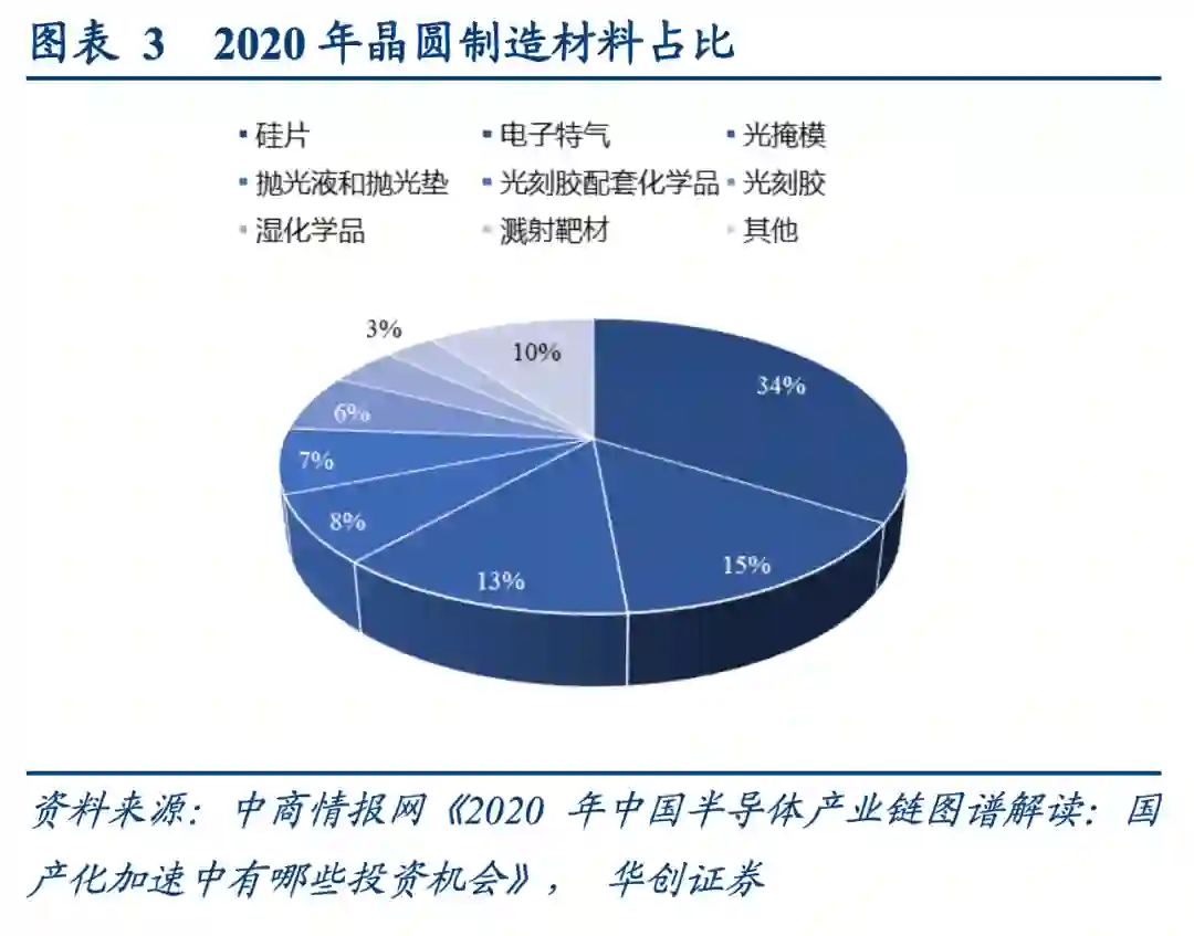 若从制造工艺来区分,半导体材料可分为晶圆制造材料、封装材料两大类。其中,晶圆制造材料是半导体材料的核心,包括硅片、光刻胶、掩膜版、电子特气、湿化学品、溅射靶材、CMP抛光材料等。