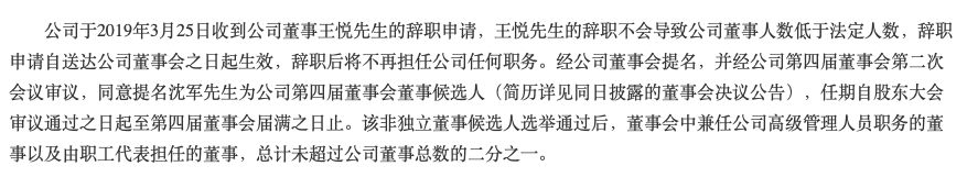 在失联之前,王悦与上市公司的最后一次联系,发生在3月25日。当天,公司收到了董事王悦的辞职申请,辞职后其将不再担任公司任何职务。