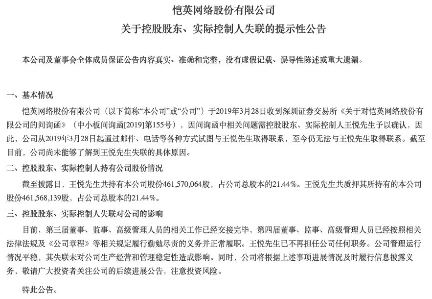 恺英网络在公告中称,公司3月28日收到深交所问询函,因问询函中相关问题需王悦确认,因此从3月28日起通过邮件、电话等各种方式试图与王悦取得联系,但未果。