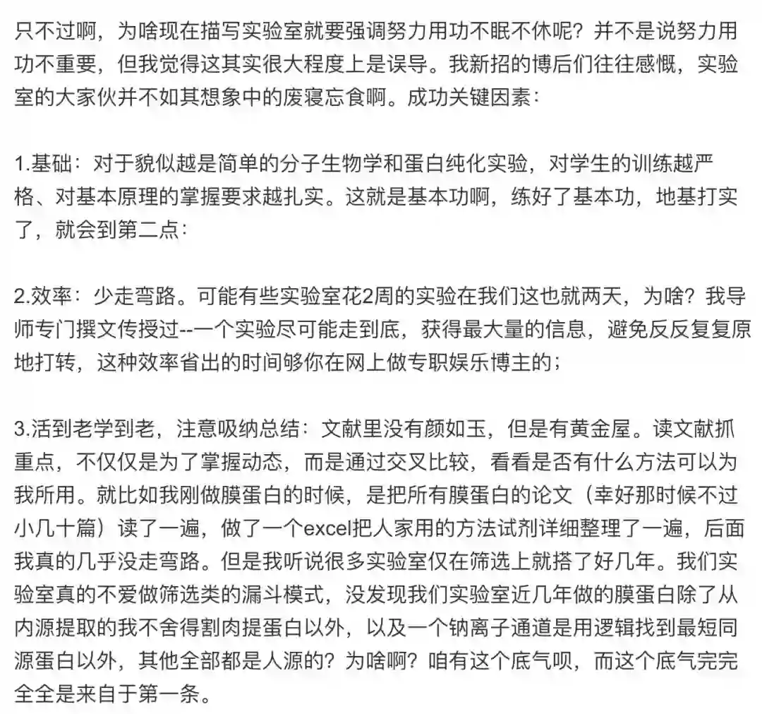 在关于殷平教授之前的报道中,对于“现在描写实验室就要强调努力用功不眠不休”,颜宁表示并不认同,“并不是说努力用功不重要,但我觉得这其实很大程度上是误导。我新招的博后们往往感慨,实验室的大家伙并不如其想象中的废寝忘食啊。”