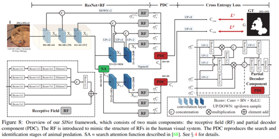 基于这些数据集,作者开发了一个新的伪装对象检测框架SINet(Search Identification Network),网络架构如下: