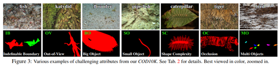 伪装或者周围形似的目标检测一直是目标检测领域最有挑战性的问题,作者在论文中提出了一个新的数据集COD10K,包含一万张自然场景下的伪装对象,总计78个对象类别,图像通过标签、box框、实例分割、Matting级别的标注。