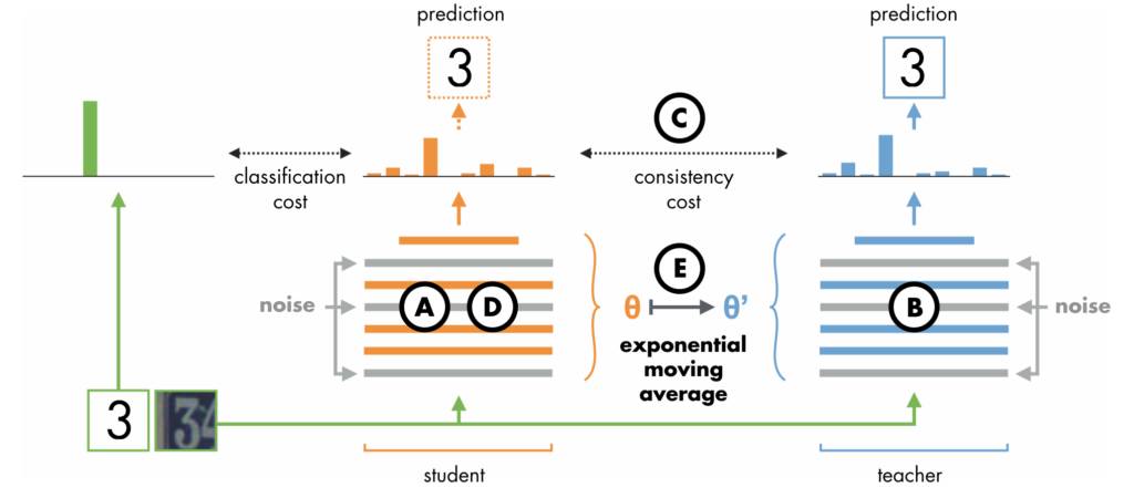 3. 在每个训练步骤中,让「教师」和「学生」一起评估一个小批量。在两个预测之间添加一致性代价函数(例如交叉熵)。