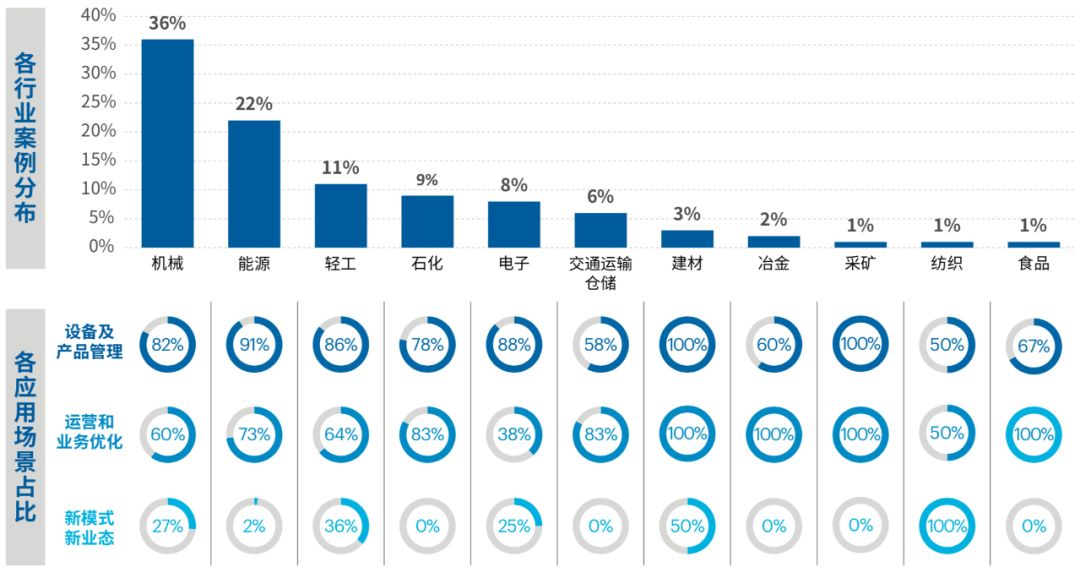 在应用行业方面,机械行业中高端设备的应用日趋成熟,能源行业的资源配置优化潜力巨大。数字化程度高的机械、能源行业成为应用工业互联网平台的主力军。机械行业占全部案例的36%,面对强烈的制造服务化转型的需求,一方面平台助力设备管理从人工粗放管理向远程、精准智能化管理过渡,另一方面金融与机械行业融合创新助力企业探索新业务增长模式。能源行业占全部案例的22%,以电力行业为例,企业通过工业互联网实现企业内外数据汇聚,通过分析市场、发电能力、发电需求、天气和定价等影响因素,优化发电和交易计划,实现生产端、电网和消费端的协同和优化。