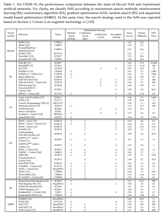 因此,神经架构搜索(NAS)应运而生。NAS旨在通过使用有限的计算资源,以尽可能少的人工干预的自动化方式设计具有最佳性能的网络架构。NAS- RL[11]和MetaQNN[12]的工作被认为是NAS的开创性工作。他们使用强化学习(RL)方法得到的网络架构在图像分类任务上达到了SOTA分类精度。说明自动化网络架构设计思想是可行的。随后,大规模演化[15]的工作再次验证了这一想法的可行性,即利用演化学习来获得类似的结果。然而,它们在各自的方法中消耗了数百天的GPU时间,甚至更多的计算资源。如此庞大的计算量对于普通研究者来说几乎是灾难性的。因此,如何减少计算量,加速网络架构的搜索[18-20,48,49,52,84,105]就出现了大量的工作。与NAS的提高搜索效率,NAS也迅速应用领域的目标检测(65、75、111、118),语义分割(63、64、120),对抗学习[53],建筑规模(114、122、124),多目标优化(39、115、125),platform-aware(28日34、103、117),数据增加(121、123)等等。另外,如何在性能和效率之间取得平衡也是需要考虑的问题[116,119]。尽管NAS相关的研究已经非常丰富,但是比较和复制NAS方法仍然很困难[127]。由于不同的NAS方法在搜索空间、超参数、技巧等方面存在很多差异,一些工作也致力于为流行的NAS方法提供一个统一的评估平台[78,126]。