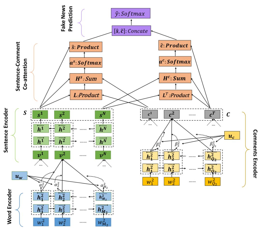 用解释来证实虚假信息。以假新闻为例,可解释虚假信息检测的目的是获取top-k可解释的新闻句子和用户评论,用于虚假信息的检测。它有可能改进检测性能和检测结果的可解释性,特别是对于不熟悉机器学习方法的终端用户。可以看出,新闻内容中并不是所有的句子都是假的,事实上,很多句子是真的,只是为了支持错误的索赔句。因此,新闻句子在判断和解释一则新闻是否是假的方面可能不是同等重要的。类似地,用户的评论可能包含一些重要方面的相关信息,这些信息可以解释为什么一条新闻是假的,而它们提供的信息和噪音可能也较少。可以使用以下较弱的社会监督:与原始新闻片段内容相关的用户评论有助于发现假新闻并解释预测结果。在[31]中,它首先使用带有注意力的双向LSTM来学习句子和评论表示,然后利用一个叫做dEFEND的句子-评论-注意神经网络框架(参见图4)来利用新闻内容和用户评论来共同捕获可解释的因素。实验表明,dEFEND在准确性(∼0.9)和F1(∼0.92)。另外,dEFEND可以发现可解释的注释,提高预测结果的可表达性。