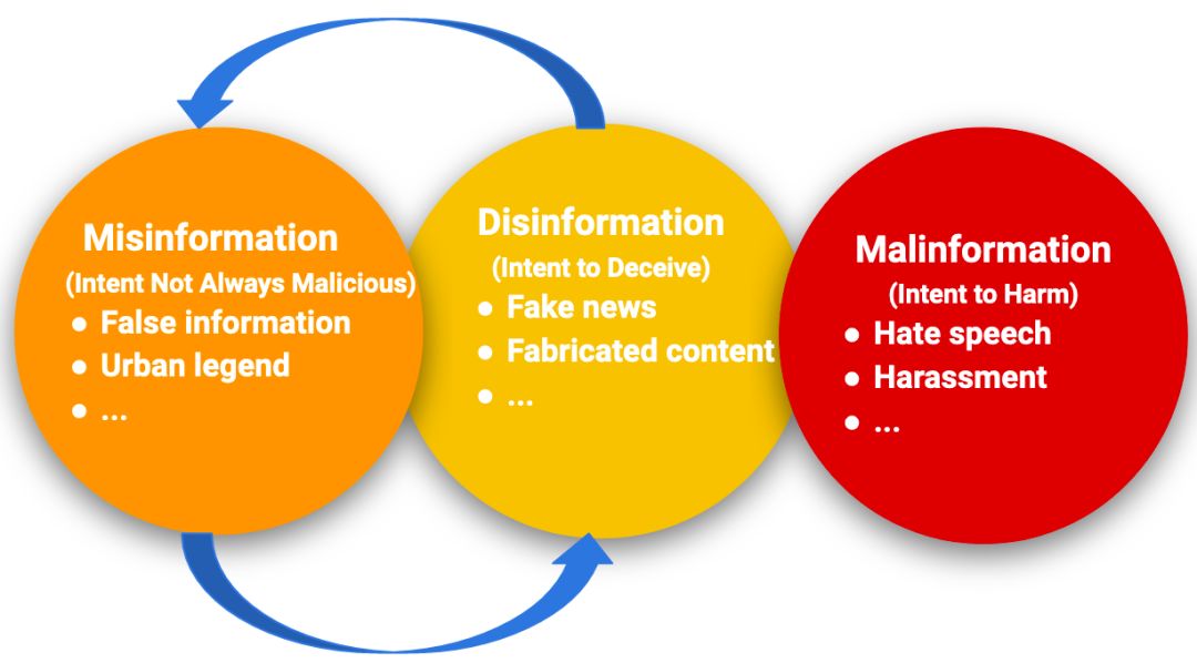 图1: 虚假信息、错误信息和恶意信息之间的关系,以及具有代表性的例子。此外,虚假信息和错误信息可以相互转化。