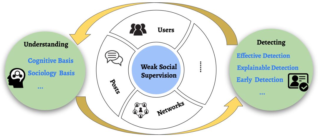 图2: 社会监督下学习理解和发现虚假信息和假新闻的示意图。
