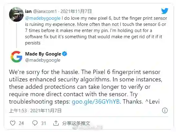谷歌回应 Pixel 6 系列指纹识别太慢