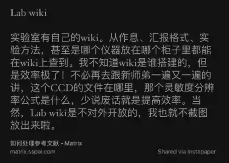 曾经看过 MilkShake羊 的《如何处理参考文献》,里面谈到她们学校实验室里有一个叫做 Lab wiki 的东西,我觉得 Treation 也可以用在这个用途上。不过不知道学校会不会接受这样的建议。我之前做一个二氧化硫性质探究的创新装置的时候,经常需要去实验室一个个柜子地去找药品,假如我们学校实验室也可以做一个 Lab wiki 的话这该有多方便啊,想找药品或者仪器手机开起来点击下就可以知道它在那个柜子里了。