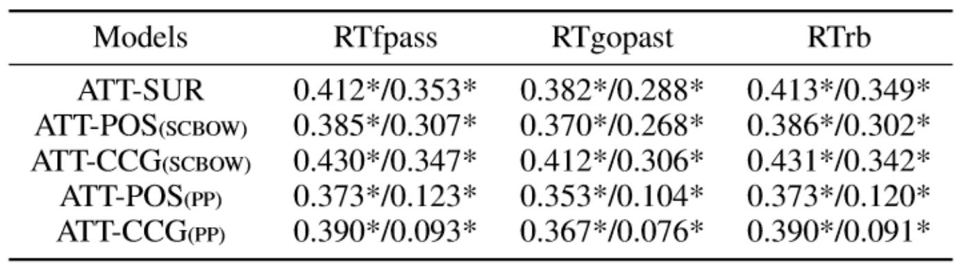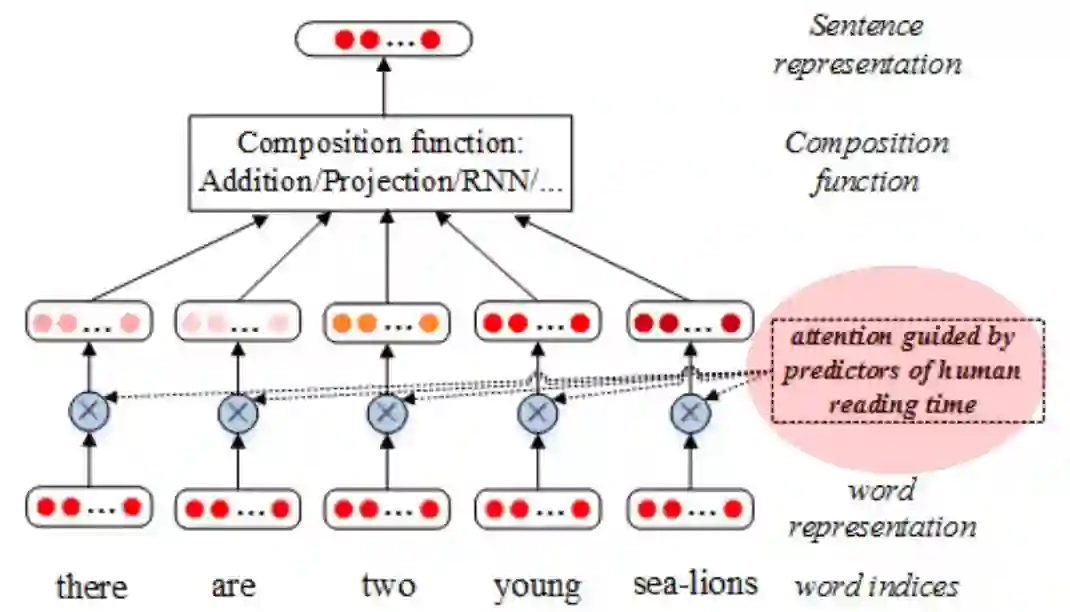 受人类注意力机制的启发,作者认为在构建句子表示时应该给重要的词汇赋予较高的权重,这样可以得到更好的句子语义表示。那么哪些词汇对句子含义的表达更重要呢?同样我们从人类阅读文本时的注意力分布寻找答案,大量的有关人类阅读时间的研究证明了词汇的特性,如词性、词长、词频、词汇惊异度(Surprisal)等,都会影响人类阅读文本时对这个词汇的关注程度。因此,作者选择了词汇惊异度和词汇的词性来对词汇的重要程度进行建模。