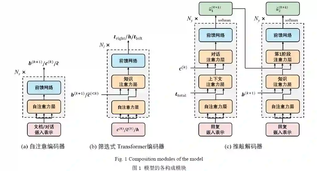 在本文中,我们提出了一种新颖的基于Transformer[6]的模型,用于更好地构建对话上下文,并利用其进行信息筛选从而生成更有意义的回复.主要思想是将信息筛选分为利用历史和忽略历史两种情况进行讨论:当忽略历史时,只需以当前对话为依据,对文档信息进行相应筛选;而当考虑历史时,应先利用其对上下文进行重新建模,然后以所得结果为依据,进行文档信息的筛选.注意到对话历史事实上并不总是与语境相关,因此在完成上述过程后我们需要对其与当前对话的相关程度进行度量,并以此为依据进行语义向量的整合,以避免引入不相关的信息作为噪声.实验结果表明,与现有的基线模型相比,我们的模型能生成语义更加连贯、知识更为丰富的回复.