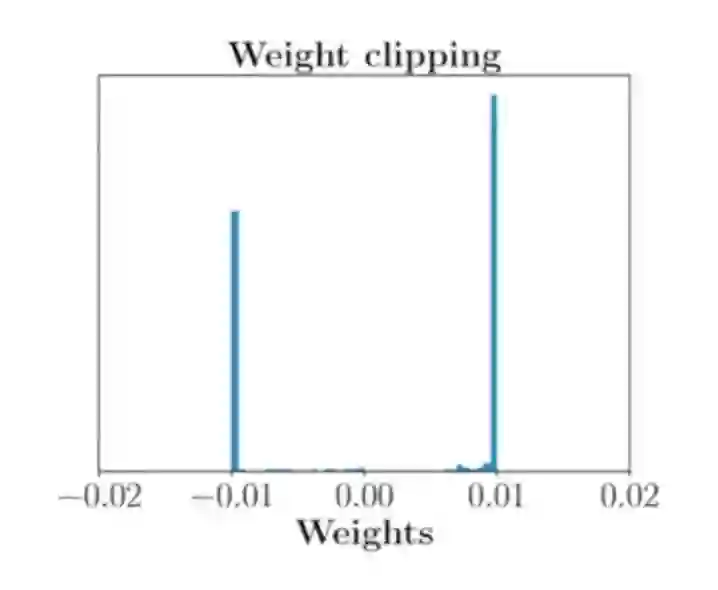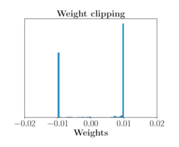 不过,WGAN 还是存在一些问题的:训练困难、收敛速度慢。这源于 weight clipping 的方法太简单粗暴了,导致判别器的参数几乎都集中在最大值和最小值上,相当于一个二值神经网络了,没有发挥深度神经网络的强大拟合能力。不过论文作者在后续 WGAN-GP 中提出梯度惩罚的方法克服了这一缺点。