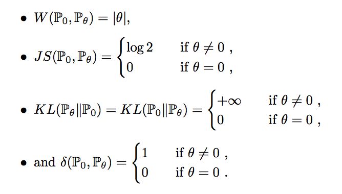 在 EM 距离下收敛于 P0,而其他距离是突变的,无法收敛。因此 EM 距离可以在两个分布没有重叠部分的情况下提供有意义的梯度,而其他距离不可以。