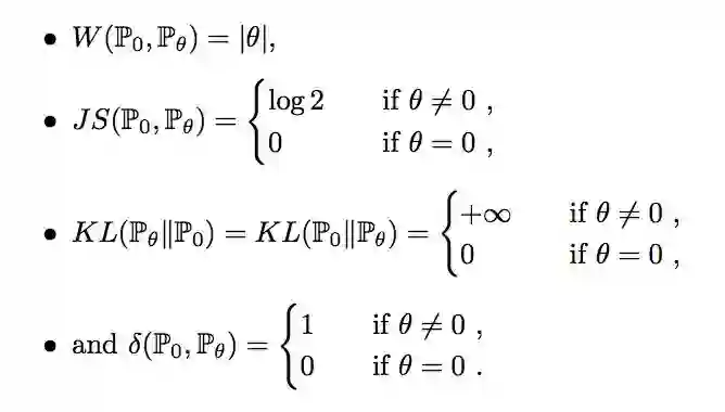 论文作者提出一个简单直观的例子,在这种情况下使用 EM 距离可以收敛但是其他距离下无法收敛,体现出 Wasserstein 距离的优越性。