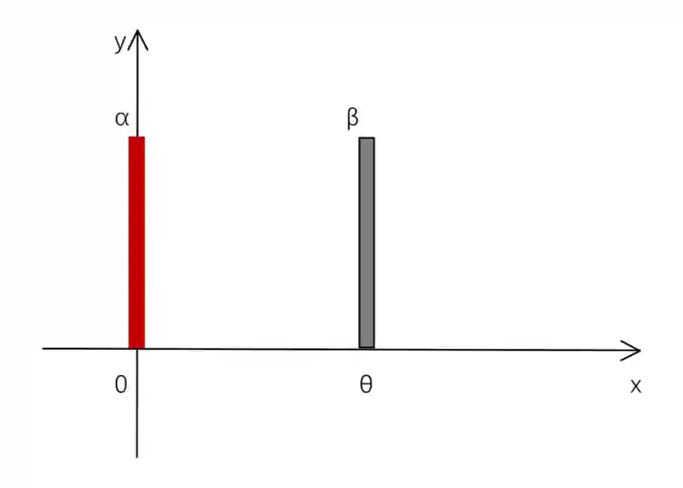 考虑如下二维空间中 ,令 Z~U[0,1] ,存在两个分布 P0 和 Pθ,在通过原点垂直于 x 轴的线段 α 上均匀分布即 (0,Z),令 Pθ 在线段 β 上均匀分布且垂直于 x 轴,即 (θ,Z),通过控制参数 θ 可以控制着两个分布的距离远近,但是两个分布没有重叠的部分。