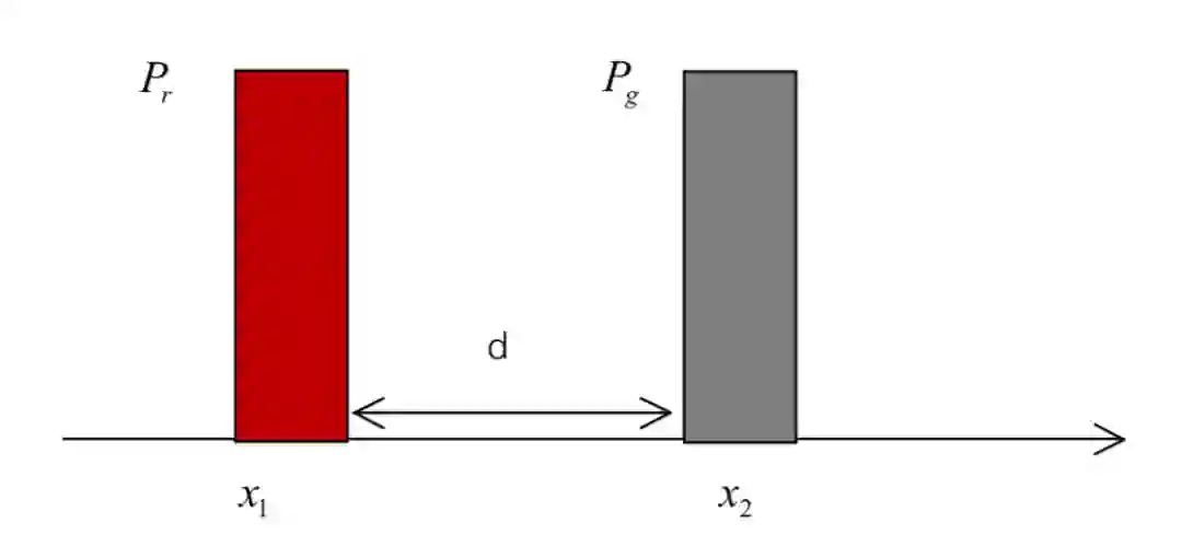 下面按照笔者的理解来解释一下为什么需要使用 1-Lipschitz 条件,考虑一个简单直观的情况,假设我们现在有两个一维的分布,x1 和 x2 的距离是 d,显然他们之间的 EM 距离也是 d: