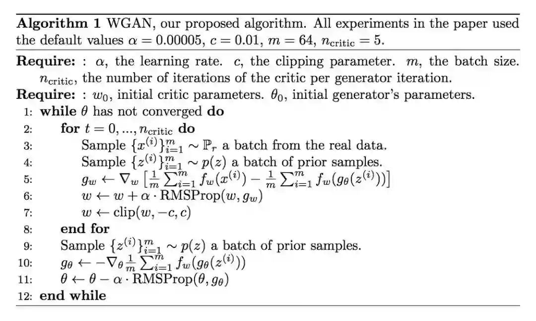 论文作者给出了如下的完整的 WGAN 算法流程,一方面优化含参数 ω 判别器,使用梯度上升的方法更新权重参数 ω,并且更新完 ω 后截断在 (-c,c) 的范围内,另一方面优化由参数 θ 控制生成样本的生成器,其中作者发现梯度更新存在不稳定现象,所以不建议使用 Adam 这类基于动量的优化算法,推荐选择 RMSProp、SGD 等优化方法。