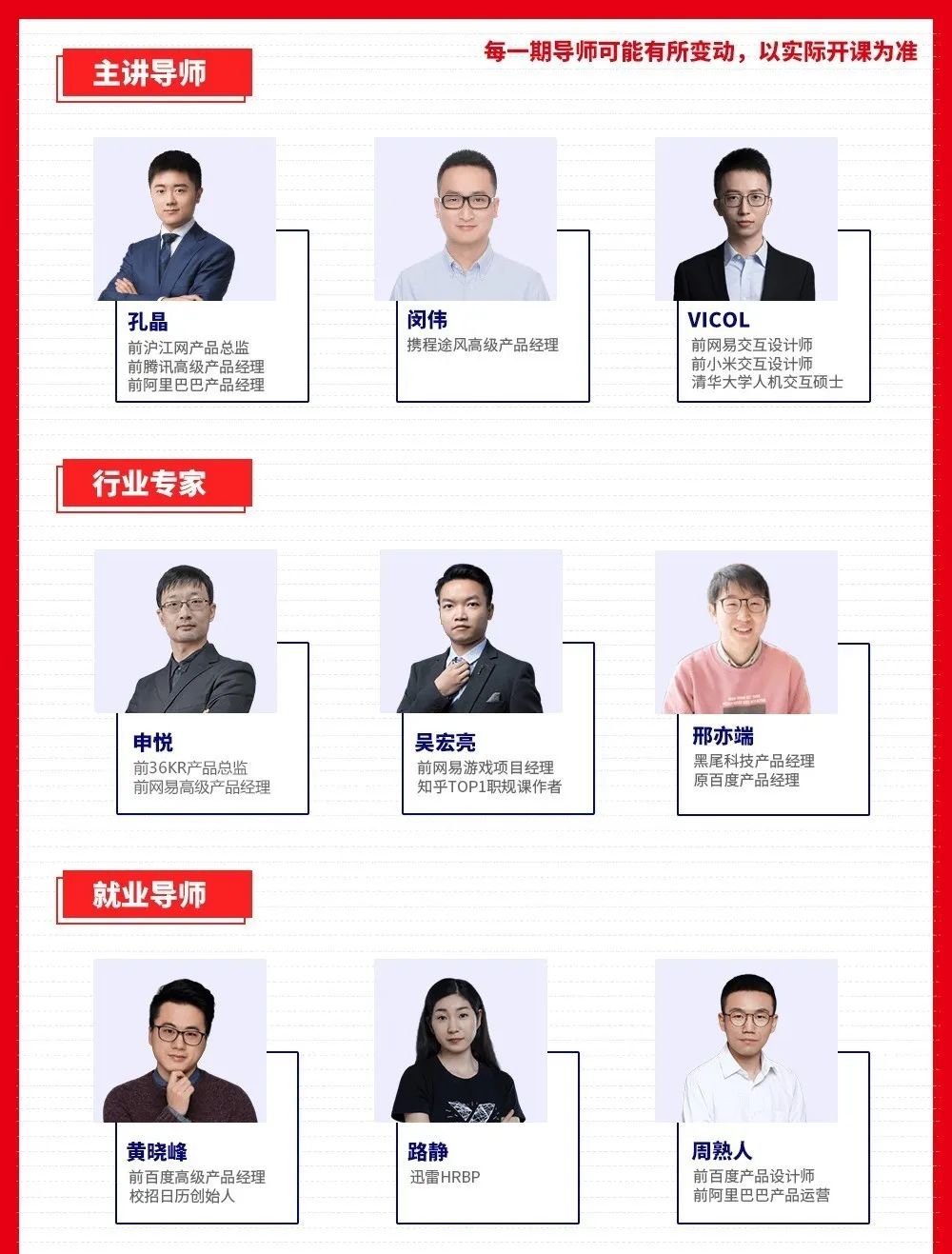 导师团均来自一线互联网大厂,他们久经打磨,专业知识过硬,同时洞察行业与市场,能带领你跟上行业趋势,学到的知识不过时。