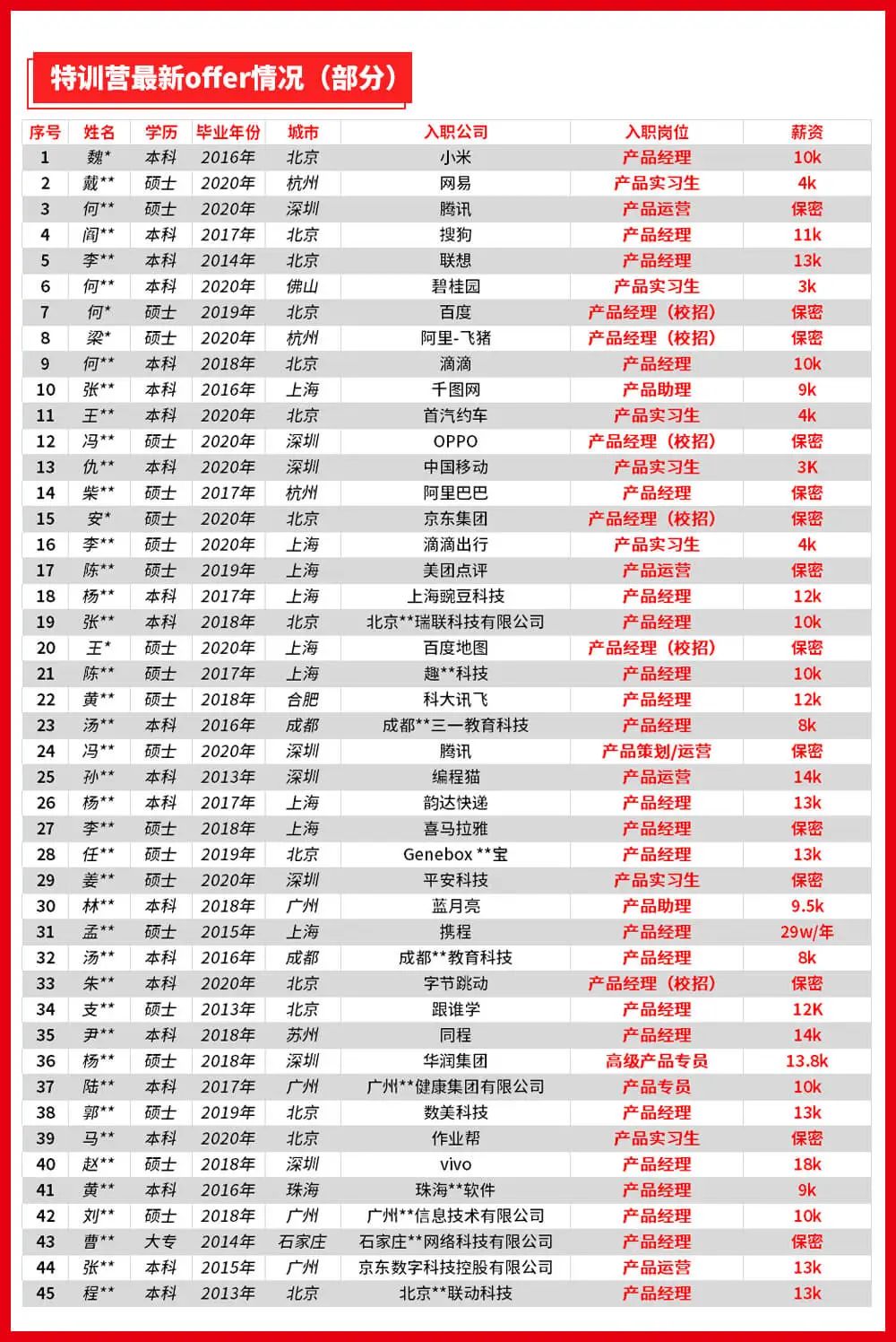 除了文中的李同学之外,特训营还曾帮助许多同学们拿下offer,以下是部分清单: