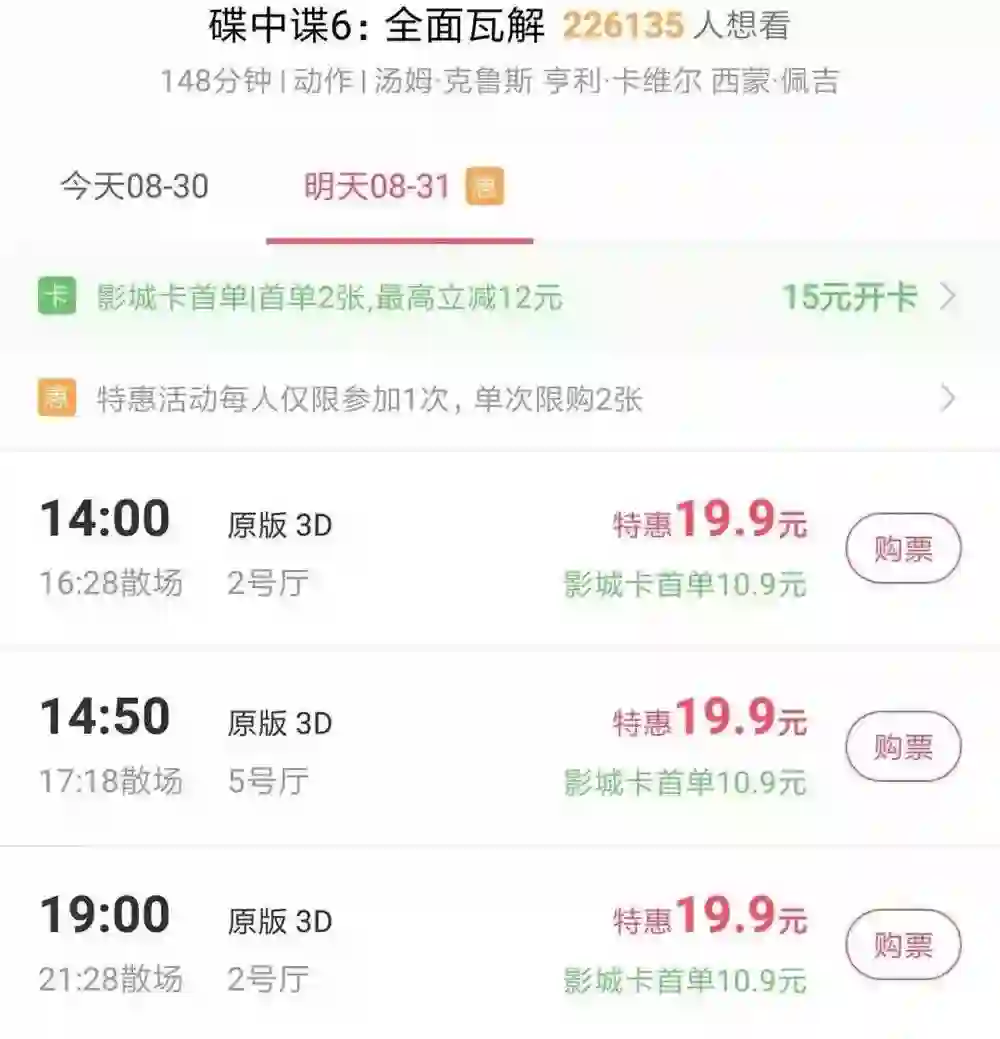 《碟中谍6》特惠19.9元票