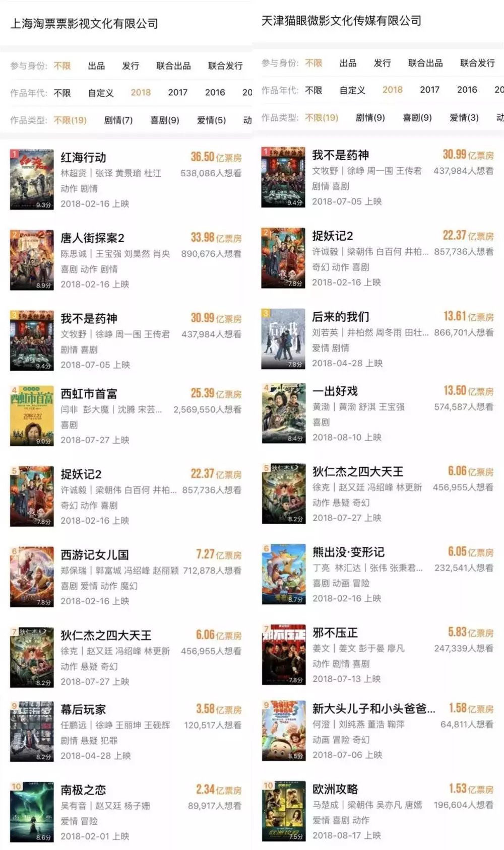 淘票票、猫眼2018年参与的电影票房top10