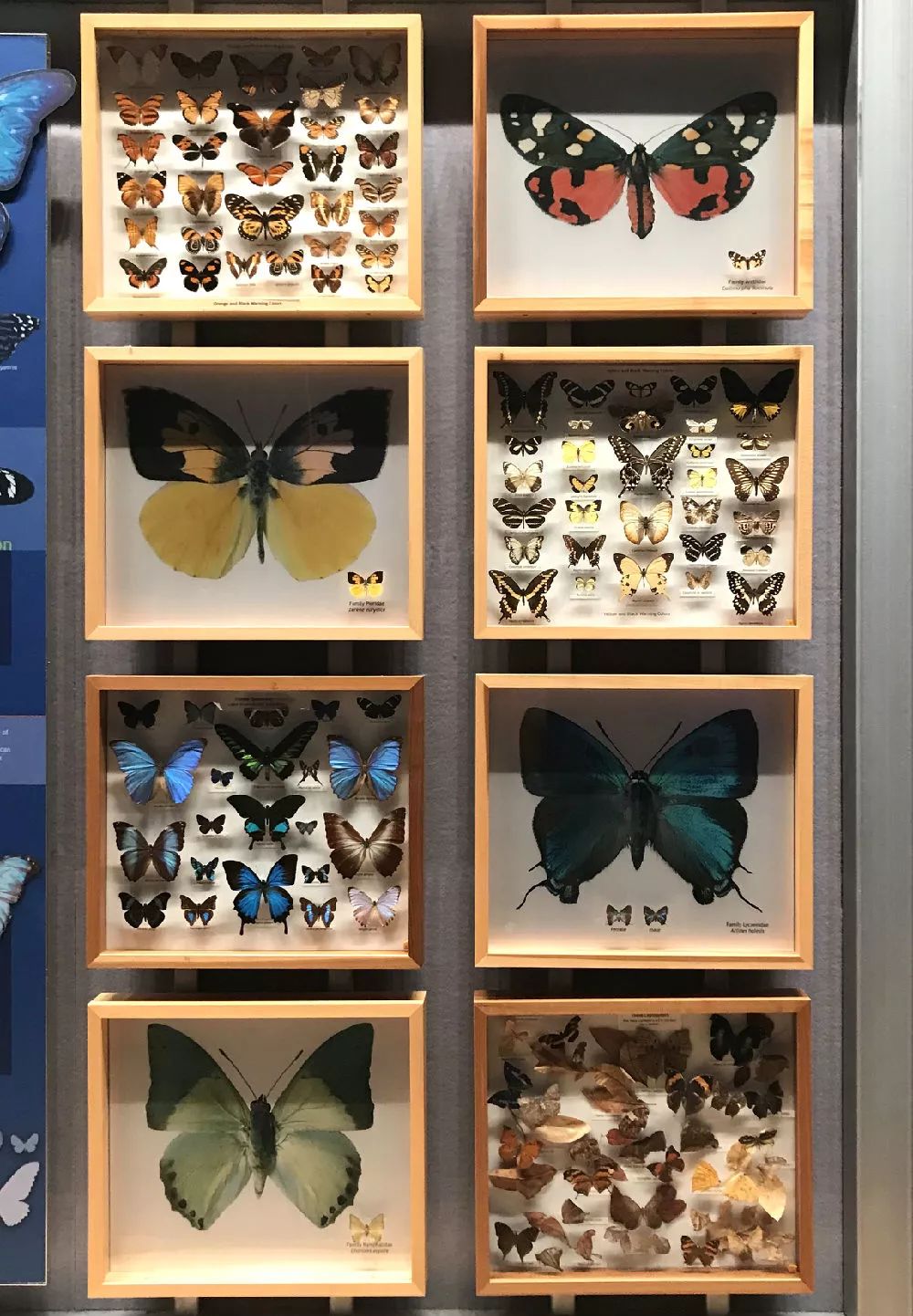 12. 蝴蝶标本展览,其中4个很大的蝴蝶其实是放大的照片,实物标本在照片的下方或右下方。个人觉得这样的展览非常好,有写标本的个头很小,在实物的旁边同时放一张大照片,可以让人看清楚细节,这很值得做个头很小的昆虫的展览来借鉴。