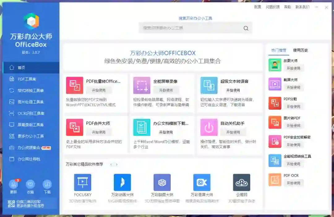 转换 Office 文档格式、批量处理 PDF、美化编辑图片……日常工作生活中,总有一些需求迫使我们安装一堆工具 App。而万彩办公大师则整合了 PDF 标注编辑、音视频格式转换、图片编辑处理、录屏演示等 60 余款实用工具及 Office 模版、图片搜索等网站,解决电脑办公过程中的各种痛点。