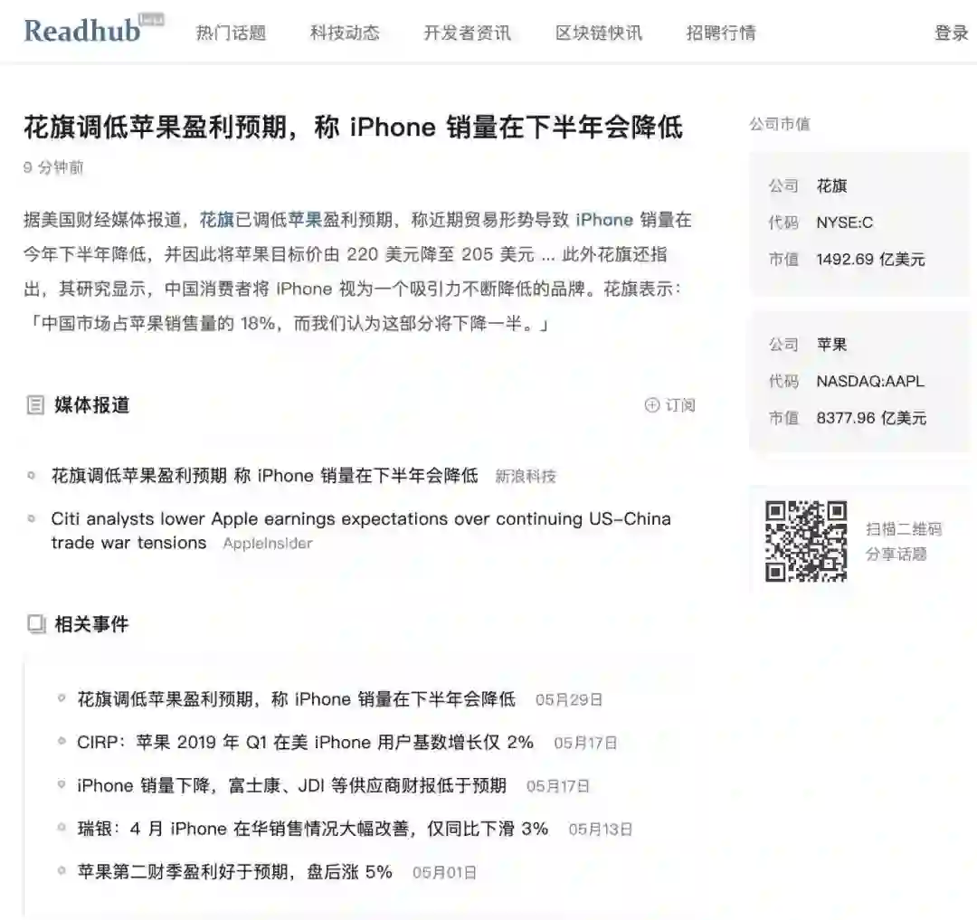 在这个自媒体遍地的时代,想全面了解最新热点事件却不是那么容易。如果你和我一样喜欢关注科技圈动态,聚合了多家媒体、更新速度快的 Readhub 就是个不错的选择。它将热点事件用话题的形式组织在一起,提供历史报道时间轴,方便全方位了解。除了科技新闻,Readhub 还提供了开发者资讯、区块链快讯、招聘行情等板块,每天 3 分钟,了解天下事。