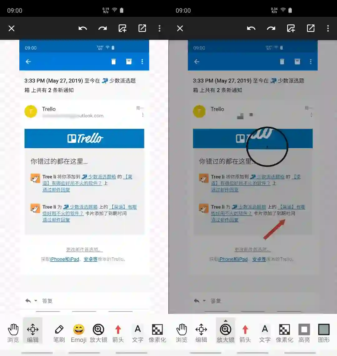 要问 iOS 上的图片标注工具,我一秒就能给你列出 iMark、Pico、Annotable 等不下 10 款应用,而在 Android 上,这一需求却鲜有开发者问津。而马克标注则是我找到的最佳选择之一,它不仅提供了涂鸦、文字、框选、马赛克等基础工具,还允许你添加 emoji、放大镜和高亮等,自定义样式丰富,功能较为齐全。