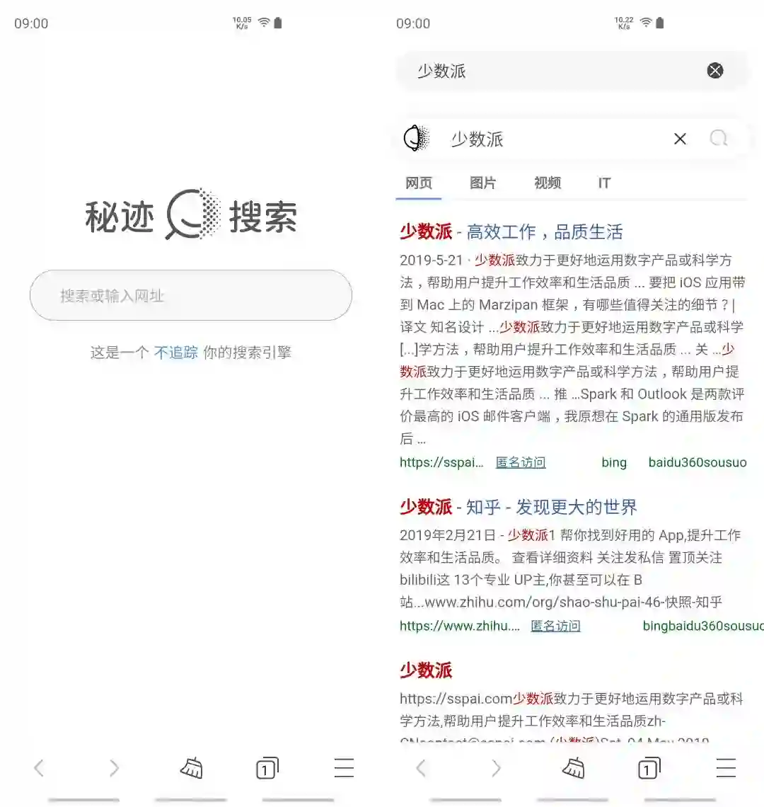 秘迹搜是一款有些特立独行的搜索 App,它不会依据关键词和手机信息追踪用户,也不会依据历史搜索记录推送个性化广告。唯一所做的,就是综合百度、必应、搜狗等引擎,为你献上最佳搜索结果。如果你不放心,只需点击界面底部的小扫帚,即可清理所有浏览痕迹。