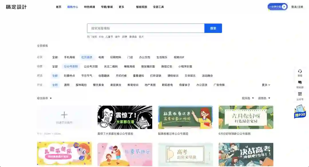 如何制作一张美观得体的海报?Photoshop 可能是你首先想到的答案。然而,PS 考验技巧和耐心,正版也售价不菲。为了解决这些问题,稿定设计 是你的最佳选择之一。它提供了数百种模板,覆盖微信公众号、淘宝商品介绍、动态二维码、线下海报等多种尺寸类型,都由专业设计师出品,可以在线免费编辑,改几个字就是一张出彩海报。