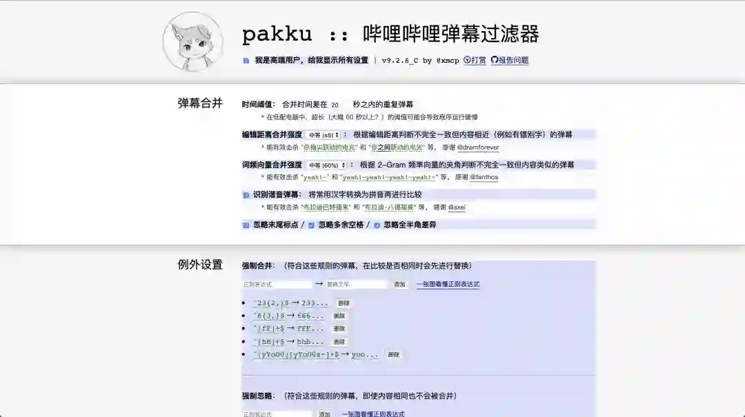 弹幕可以说是众多 B 站视频的灵魂,但有时,过于密集的弹幕刷屏也会使人厌烦,pakku 就为解决这一问题而生。启用后,它会将短时间内集中出现的相似弹幕自动合并为一条,在不遮挡画面主要内容的同时,达到欣赏优质弹幕的目的。在 pakku 的设置中,你还可以调整弹幕合并样式、算法等,或者用正则表达式预先过滤弹幕,个性化你的 B 站体验。