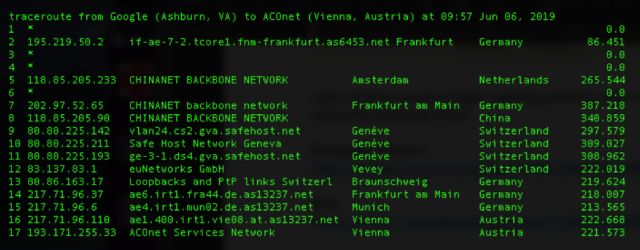 结果是:原本发送到使用受影响的IP地址的电信提供商的流量大部分通过中国电信的设备来传输,然后或被发送到最后一站,或在绕道引起的长时间等待中被丢弃。Oracle的安全分析师Doug Madory最先报告了这次泄露,他所做的路由跟踪显示了传输路径绕了多大的圈子。以下屏幕截图显示了从弗吉尼亚州的谷歌云服务器开始的流量通过中国电信的骨干网络传输,最终传输到位于奥地利维也纳的目标IP地址。