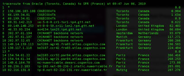 第二个屏幕截图显示了多伦多的Oracle数据中心与法国受影响的IP地址之间的类似路由。