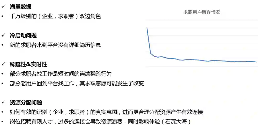 资源分配问题:如何有效的识别用户 ( 企业、求职者 ) 的真实意图,进而更合理地分配资源从而产生有效连接;岗位招聘希望高效匹配人才,过多的连接会导致资源浪费,同时影响体验 ( 石沉大海 )。