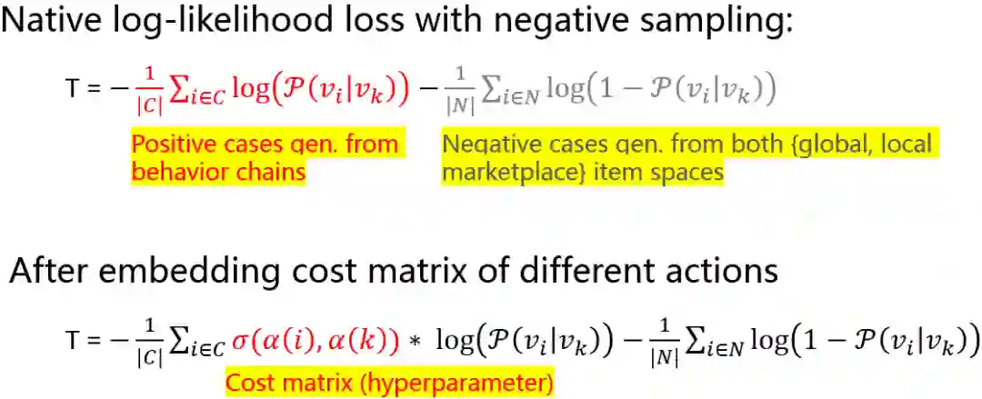图中上面的公式表示不考虑代价敏感时向量训练的损失函数,其作用是使正样本之间的向量表示更相似,同时正负样本之间的表示区别更大。图中下面的公式是考虑代价敏感时向量训练的损失函数,具体做法是区分点击和投递两种行为,在正样本之间加入一个代价矩阵,表示该样本的行为是哪一种,表示不同行为之间的代价权重,是一个根据经验给出的超参数。