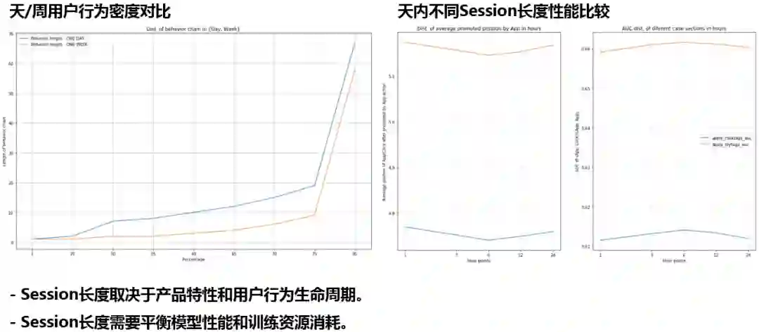Airbnb的经验是将Session划分为2周,58招聘则进行不同的尝试;上图左半部显示的是将Session划分为1天或1周时的用户行为密度对比,其中蓝色表示划分间隔为1天,黄色为1周,图中纵轴表示用户不区分点击或投递的行为链长度,纵轴表示长度所占百分比,可以看出差异并不显著,故初步选定为1天;上图右半部显示的是天内不同Session长度性能比较,左图表示不同划分时平均推荐位置排序,越小表示相关结果的推荐越靠前,右图表示预测结果的AUC,越高代表预测结果越准确,两个度量指标均为6小时划分最优;Session长度取决于产品特性和用户行为生命周期;Session长度需要平衡模型性能和训练资源消耗。